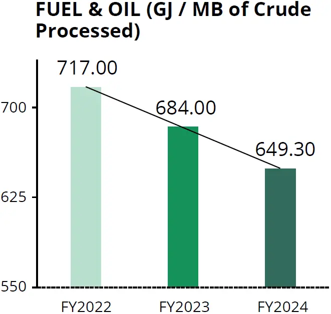 Petron’s average energy intensity decreased by 4.8% year-overyear, driven by sustained efforts in managing its energy use and implementing energy efficiency measures in their refinery operations. In 2024, energy reduction initiatives reached an 85.4% implementation rate through various programs such as: i) Fuel, Steam, Water & Power Balances; ii) Fuel, Utilities, Loss & Conservation Activities; and iii) Fuel Insights & Recommendations for Efficiency. These efforts resulted in savings of 9.5 million liters of oil equivalent, while the Empower Change (Water + Electricity Conservation) program reduced electricity consumption by 658.7 MWh. The energy management programs at Petron Bataan Refinery focus on optimizing resource efficiency, promoting collaboration, and fostering conservation awareness. They provide usage projections for fuel, steam, water, and power to guide operations and analyze variances for better performance. The programs also enhance collaboration by keeping the refinery informed about energy initiatives, addressing implementation challenges, and encouraging feedback. Additionally, they drive actions for