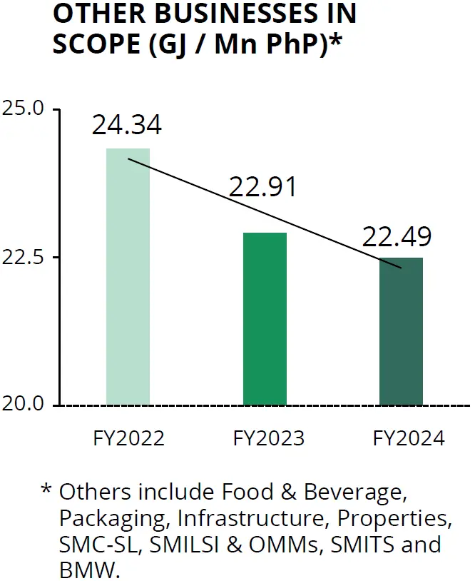 In 2024, rising demand from key sectors—notably power, transport, and industry—led to a 28.7% increase in energy consumption by our Power business. In contrast, energy consumption declined by 10.3% at Petron and by 5.6% on average across our Cement businesses. Energy use among other business units remained at about 6% of total consumption, but increased by 5.6% versus 2023.