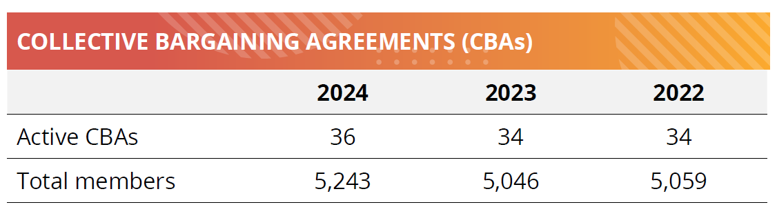As of end-2024, the SMC Group had existing bargaining agreements with 36 active labor unions, an increase of two from the previous year. Total union membership also increased by 4%, reaching 5,243 employees and covering 9% of our workforce.