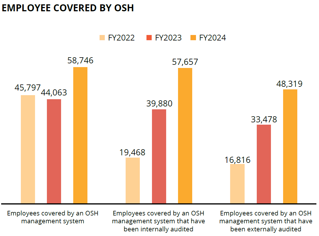 Expanded compliance assessments for both General Labor Standards (GLS) and Occupational Safety and Health Standards (OSHS), covering SMC facilities and third-party contractors. GLS tabletop assessments involved 843 participating entities (up from 472 in 2023), while OSHS assessments reached 865 entities (from 550 in 2023).